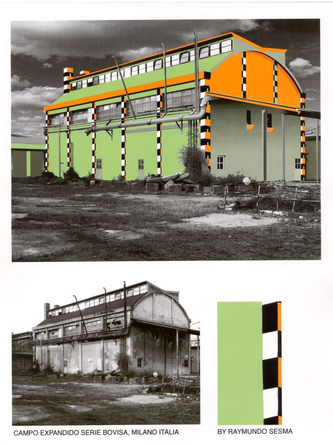 Raymundo Sesma develops commissioned, site-specific artistic interventions conceived for buildings, architecture, and outdoor spaces, transforming architectural surfaces and urban structures into expanded fields of pictorial and sculptural action. A significant example is Campo Expandido VII, a monumental public artwork presented in Basel on the occasion of the contemporary art fair Balelatina.